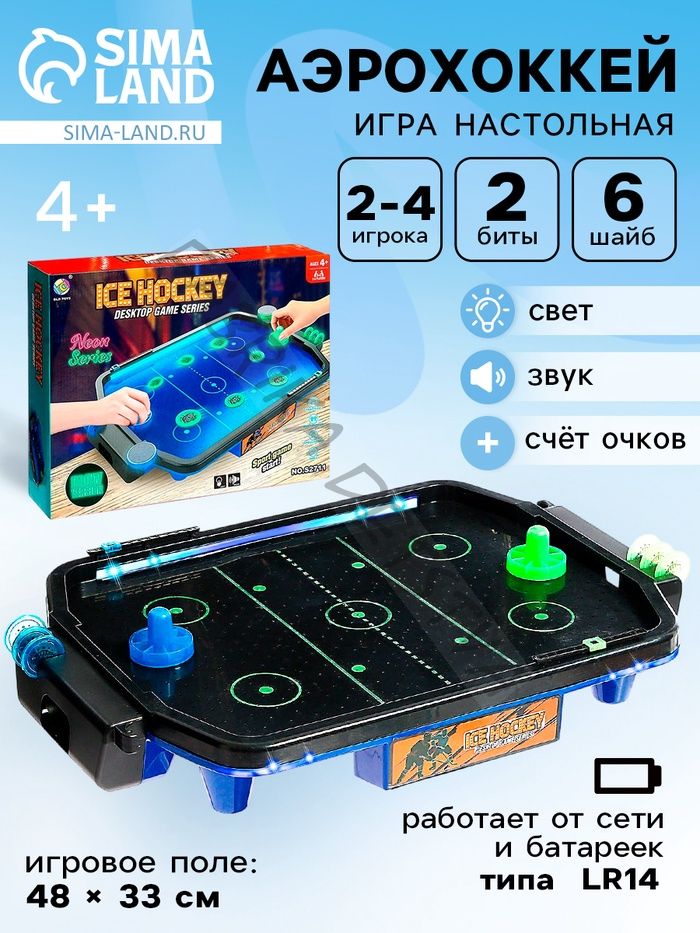 Устройте настоящую баталию — соберите всю семью за одним столом и сыграйте в настольный аэрохоккей! Отличная возможность погрузиться в динамичную игру и весело провести время не выходя из дома! Световые и звуковые эффекты порадуют ребёнка и позволят максимально погрузиться в игровой процесс. Как играть Правила просты: забивайте как можно больше шайб своему сопернику и не дайте ему забить гол в ваши ворота! Чем полезна игра Аэрохоккей — это не только весело и интересно, но и полезно. Играя в аэрохоккей «Кибердуэль», ребёнок прокачает координацию движений, меткость и реакцию. Именно эти качества помогут игроку победить! Аэрохоккей «Кибердуэль» рекомендован для детей от 4 лет. Рассчитан на 2–4 игроков.