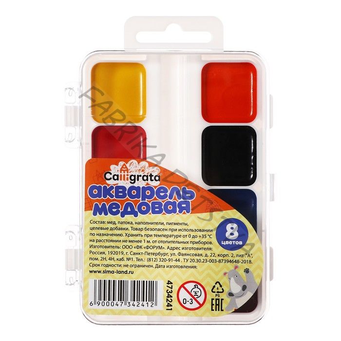 Акварель 8 цветов Calligrata, медовая, без кисти, пластик
