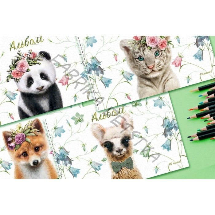 Альбом для рисования А4, 40 листов на гребне "Звери Ми-Ми-Ми", обложка мелованный картон, твин лак, конгрев, блок 100 г/м2