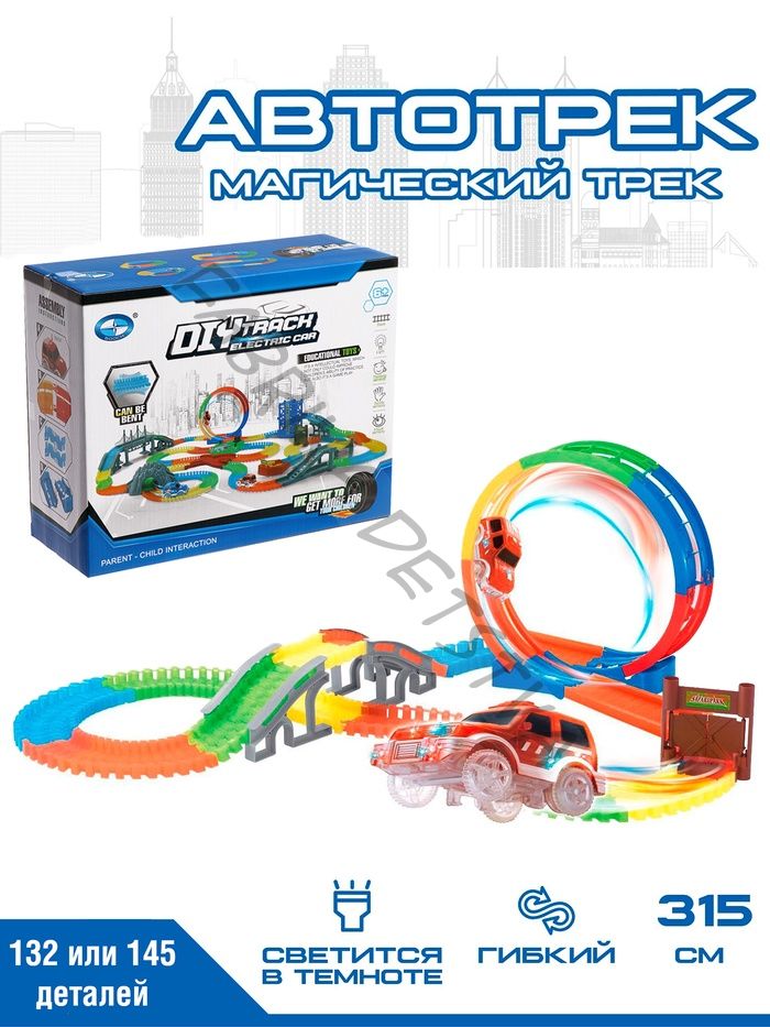 Автотрек «Магический Трек», гибкий, светится в темноте, 132/145 детали, мёртвая петля, МИКС