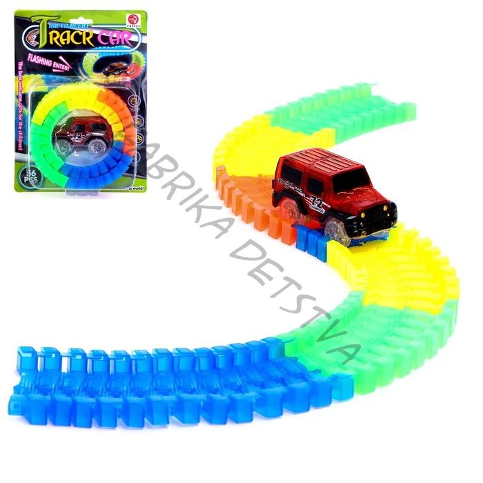 «Магический автотрек» — это невероятно зрелищный аттракцион, полный драйва и приключений! Гибкая светящаяся трасса и реалистичная машинка-внедорожник не оставят равнодушным ни одного любителя гонок! Особенности автотрека Дорогу можно собирать по-разному: например так, чтобы она поворачивала и петляла в разные стороны, была выпуклой или вогнутой, а ещё её можно закольцевать, чтобы машинка ездила внутри неё. Трасса светится в темноте. Все элементы выполнены из безопасного пластика. Из нескольких таких наборов можно составить длинную трассу. В комплект входит 1 машинка. Работает от 1 батарейки типоразмера АА, в комплект не входит. Не только увлекательно, но и полезно! Играя с набором, ребёнок развивает мелкую моторику рук, познавательную активность и воображение, становиться усидчивее и внимательнее.