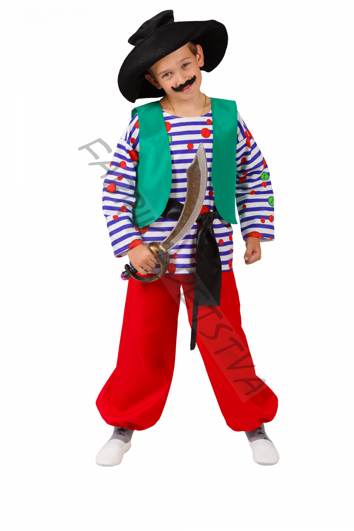 Забавный сценический костюм "Бармалей", наклеивающиеся усы и пиратский кинжал превращают ребёнка в морского разбойника, либо весёлого матроса, либо смелого мореплавателя. Костюм подойдет для театральных постановок, новогодних и детских утренников.
