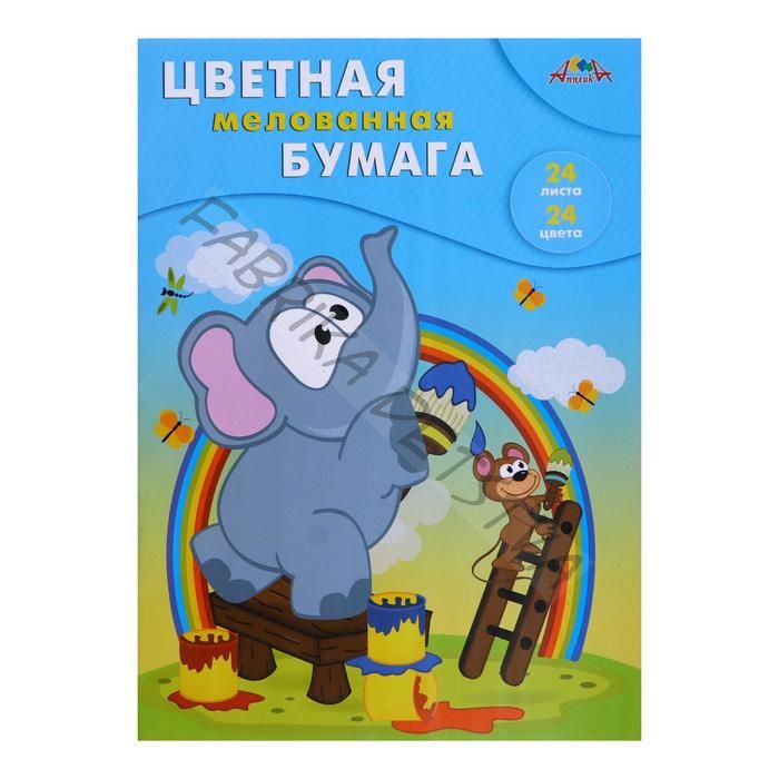 Цветная односторонняя мелованная бумага формата А4, 24 листа, 24 цвета, плотность 60 г/м2. Внутренний блок - мелованная бумага двойного прокраса с одной стороны, что дает насыщенность цвета. В наборе цвета: алый, голубой, оранжевый, тёмно-синий, розовый, коричневый, лимонный, зёленый, жёлтый, аквамарин, пурпурный, тёмно-зёленый, оливковый, бирюзовый, терракотовый, светло-фиолетовый, горчичный, перламутровый, серый, песочный, грозовой, светло-розовый, сиреневый, фисташковый