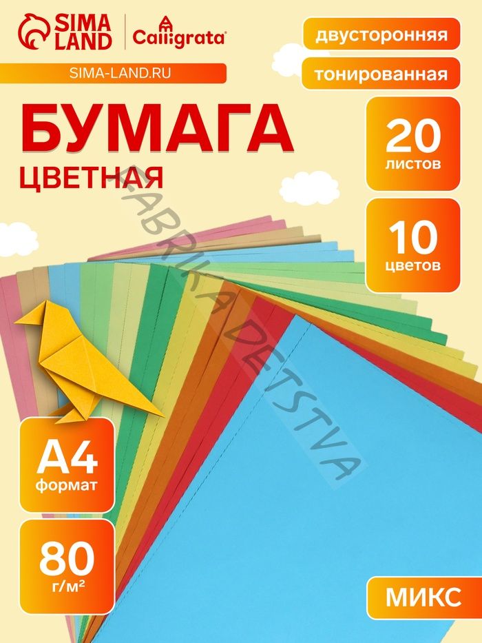 Бумага цветная двусторонняя А4, 20 листов, 10 цветов, тонированная
