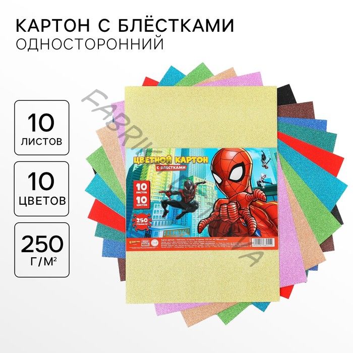 Цветной картон с блёстками, А4, 10 листов, 10 цветов, немелованный, односторонний, в пакете, 250 г/м2, «Человек-паук»