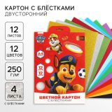 Цветной картон с блёстками, А4, 12 листов, 12 цветов, немелованный, двусторонний, в папке, 250 г/м2, «Щенячий патруль»