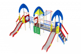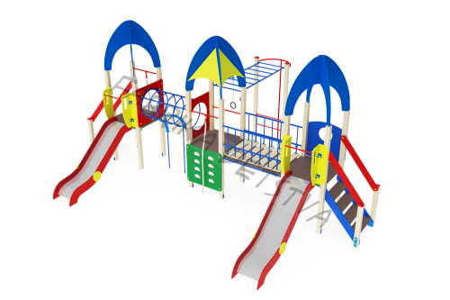 Три башни выполнены из четырёх клеёных брусьев 90х90 мм высота 2500 мм; пол из ламинированной фанеры, с антискользящим покрытием 1000х1000 мм, толщиной 18 мм; над одной башней имеется четырехскатная крыша из фанеры толщиной 9 мм, которая крепятся на декоративные арки из фанеры толщиной 18 мм, размер 1420х970 мм, две башни украшены только арками, без скатов крыши, кромки фанеры тщательно шлифованы, фанера окрашена в синий и желтый цвет. Размер башен 1000х1000х3470 мм. |