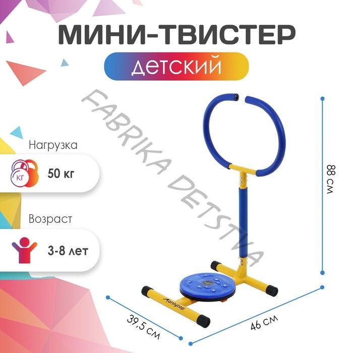 Мини-твистер — тренажёр с поворотным диском, имеющим специальное покрытие, благодаря которому происходит воздействие на определённые точки ступни. Такой метод оздоровления не имеет аналогов и приобретает всё большую популярность, ведь заниматься на нём можно прямо дома. С данной моделью малыш сможет улучшить общее состояние организма и насладиться точечным массажем стоп. Производители придумали конструкцию, благодаря которой заниматься стало ещё удобней и безопасней. Технические характеристики Возраст: от 3 до 8 лет. Имеет поворотный диск с массажным покрытием. Тренажёр сделан из безопасных материалов. Прочная устойчивая конструкция. Материал: пластик, нейлон, сталь. Максимальный вес пользователя: 50 кг