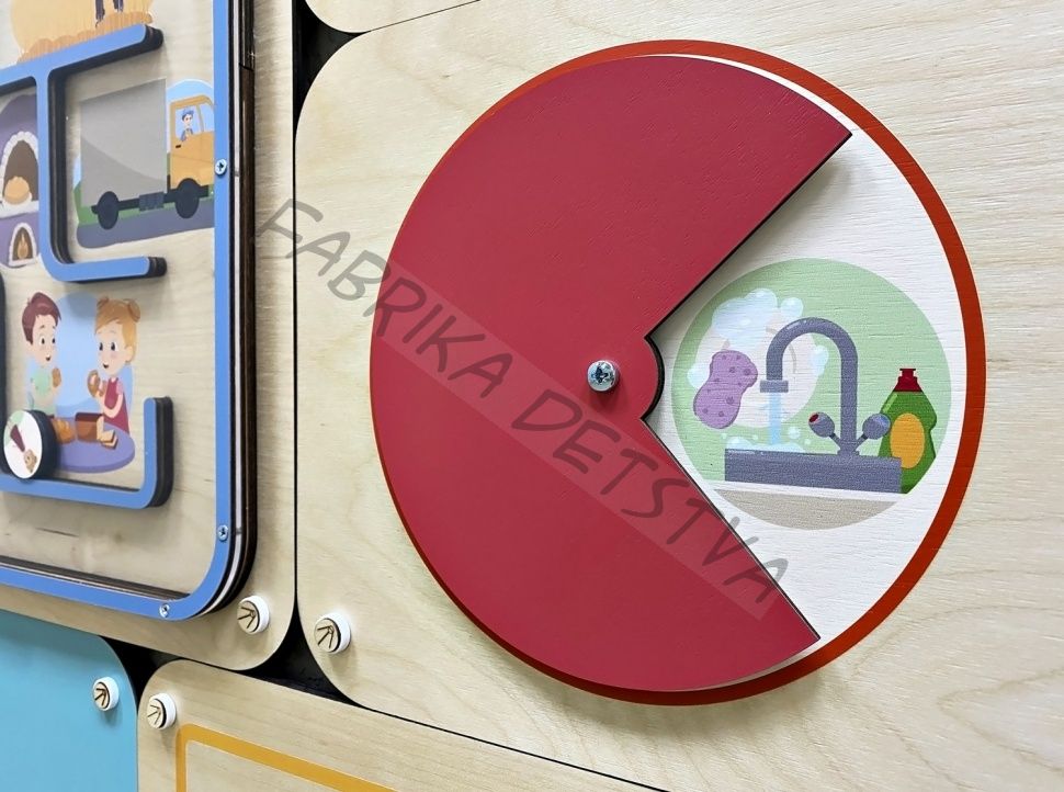 - Крутящийся диск «Домашние дела». Дети узнают, чем они могут помогать родителям дома. Обучает бытовым навыкам и самостоятельности.