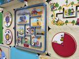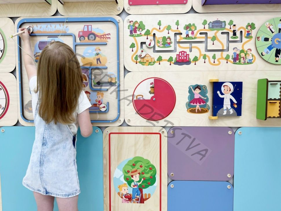 - Прочно закрепляются на стенах и не свалятся на детей, даже если они будут тянуть. Все материалы панелей безопасны для детей и сертифицированы. Малыши могут трогать, облизывать и грызть деревянные детали – их здоровью ничего не угрожает.