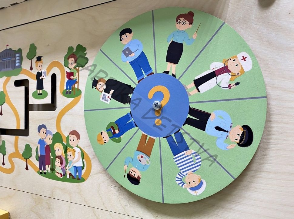 - Развивающий лабиринт «Выбирай играя» знакомит детей с важными этапами жизненного пути человека. На крутящемся диске ребёнок может выбрать одну из восьми современных профессий.