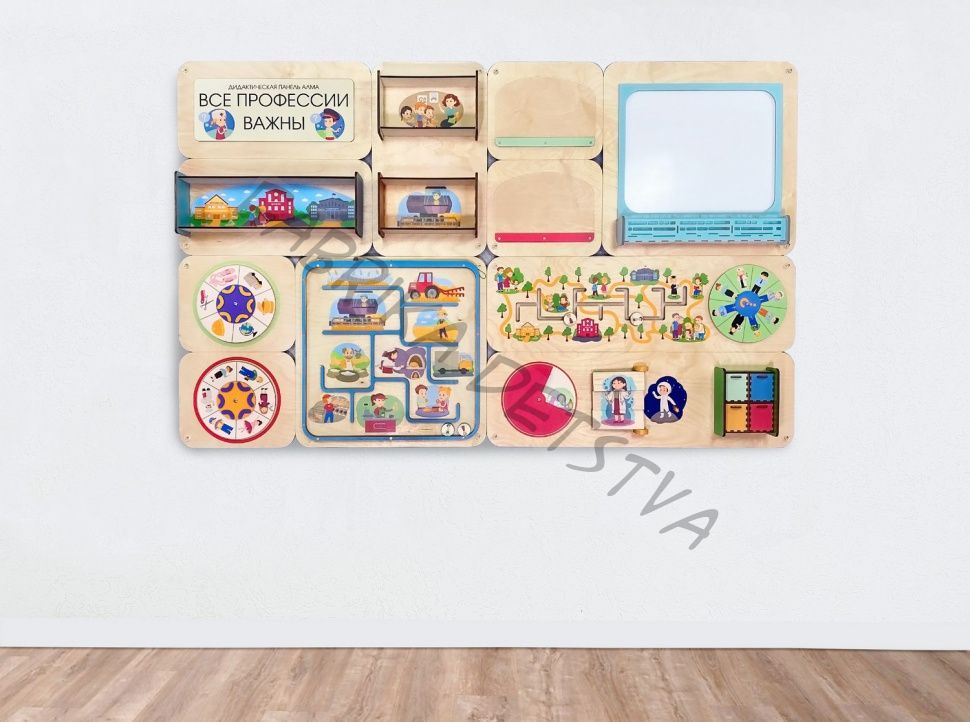 - Дети формируют представления о профессиях, учатся сопоставлять предметы, строить причинно-следственные связи, развивают логическое мышление, мелкую моторику, цветовосприятие. Занятия с панелью «Все профессии важны» помогают воспитывать в детях уважение к человеческому труду.