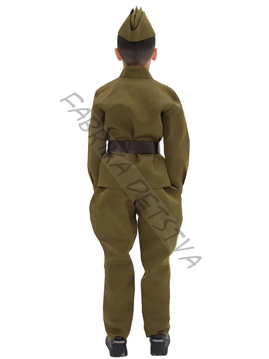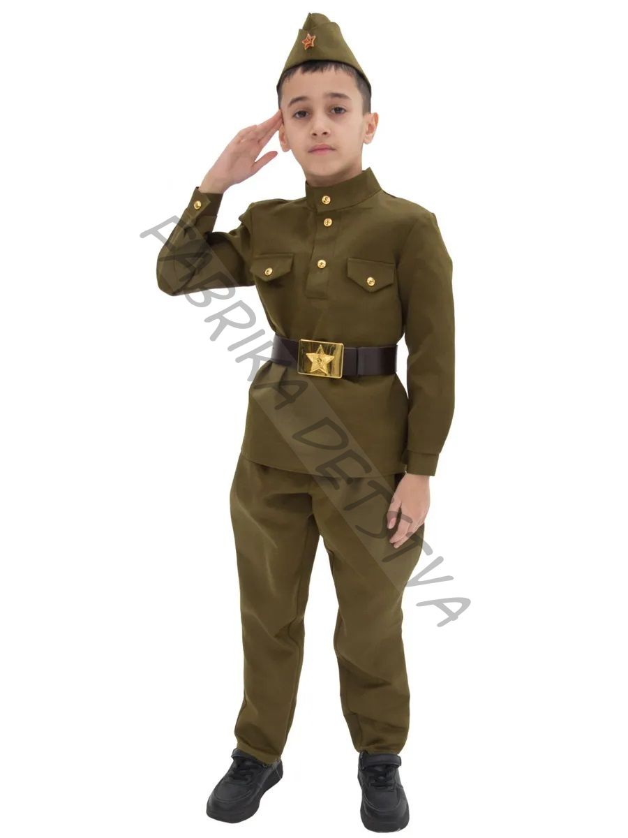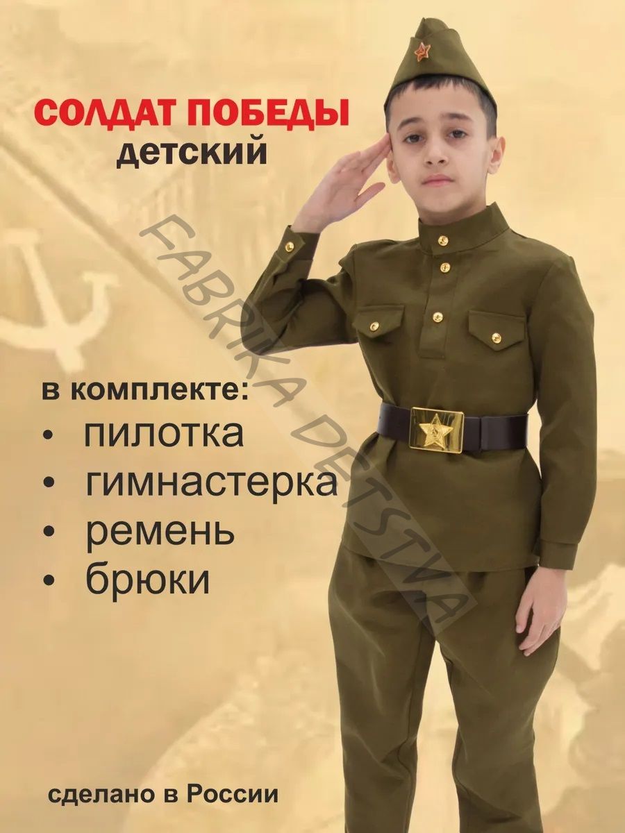 Форма военная ВОВ. Прекрасно подойдёт для военно-патриотических праздников, 23-го февраля, 9-го мая, сценических и театральных постановок. Гимнастёрка прямого силуэта, с длинным рукавом, воротник-стойка. Пилотка складная старого военного образца. Форменные брюки-галифе, расширенные вверху и зауженные к низу.