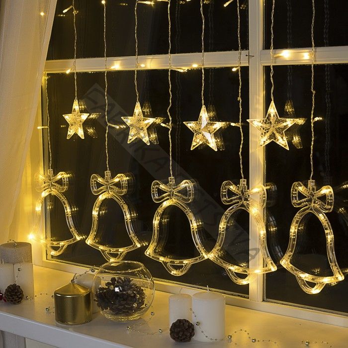 Гирлянда «Бахрома» 2.4 x 0.9 м с насадками «Колокольчики», IP20, прозрачная нить, 138 LED, свечение тёплое белое, 8 режимов, 220 В