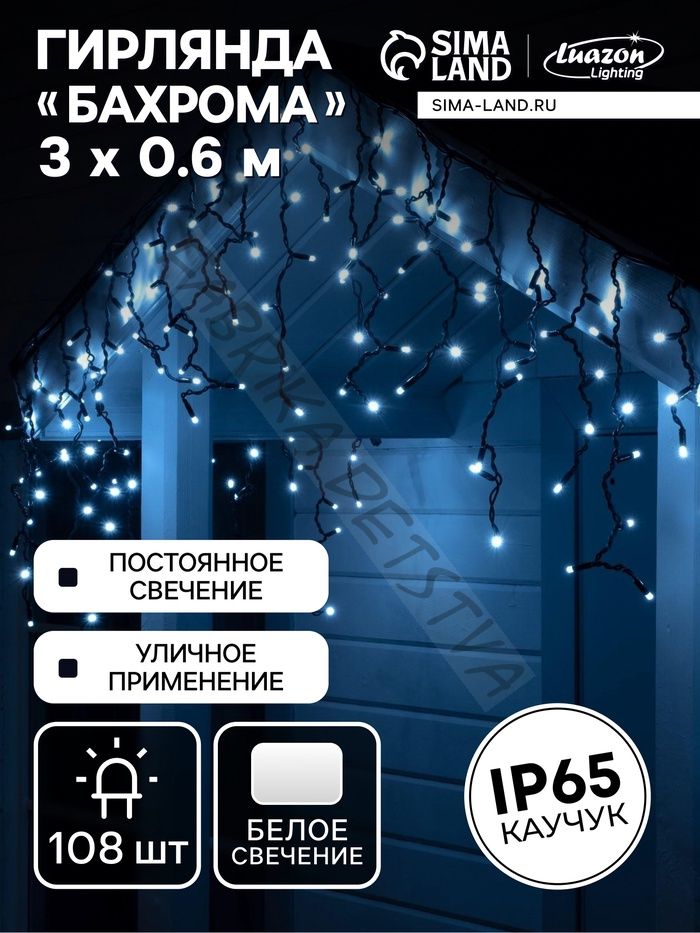 Гирлянда "Бахрома" 3 х 0.6 м, IP65, УМС, тёмная нить каучук, 108 LED, свечение белое, 220 В