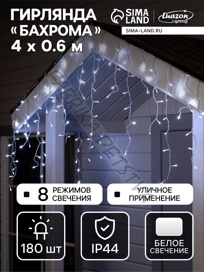 Гирлянда «Бахрома» 4 x 0.6 м, IP44, прозрачная нить, 180 LED, свечение белое, 8 режимов, 220 В