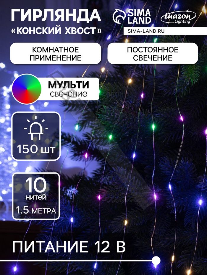 Гирлянда «Конский хвост» 10 нитей по 1.5 м, IP20, серебристая нить, 150 LED, свечение мульти, 12 В
