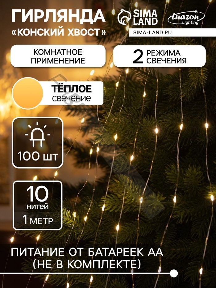 Гирлянда «Конский хвост» 10 нитей по 1 м, IP20, серебристая нить, 100 LED, 2 режима, батарейки AAх3 (нет в комплекте), свечение тёплое белое