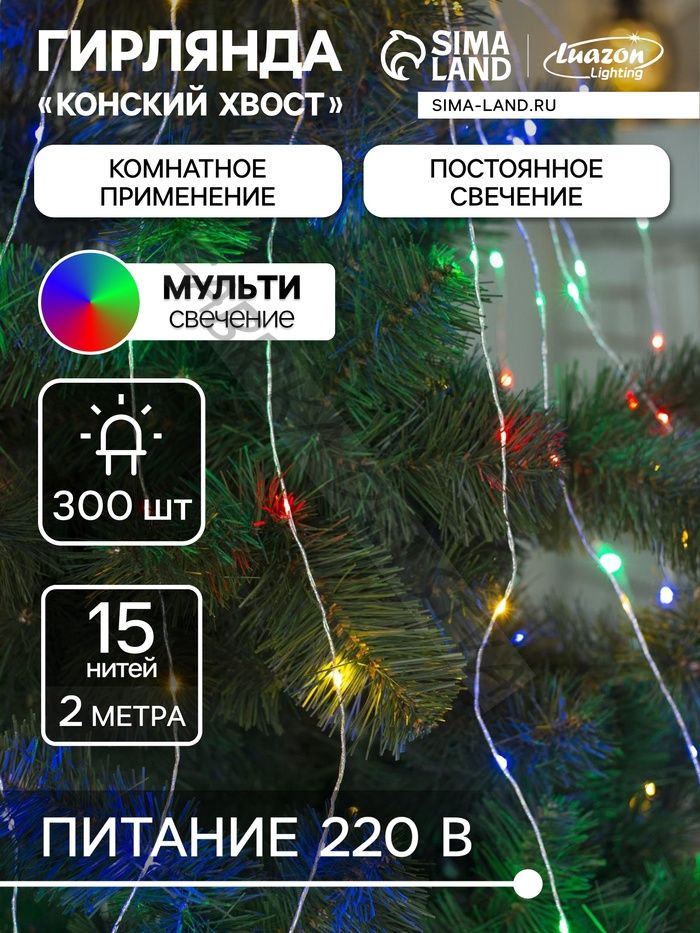 Гирлянда «Конский хвост» 15 нитей по 2 м, IP20, серебристая нить, 300 LED, свечение мульти, 220 В