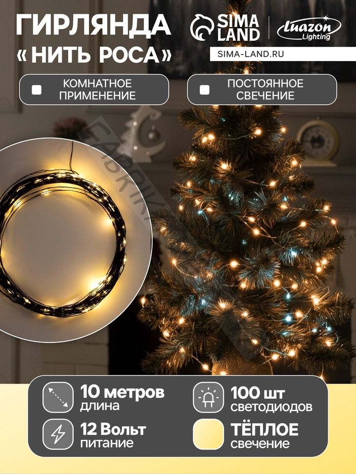 Гирлянда «Нить» 10 м роса, IP20, чёрная нить, 100 LED, свечение тёплое белое, 12 В