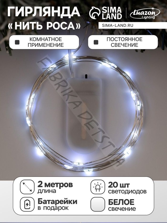 Гирлянда «Нить» 2 м роса, IP20, серебристая нить, 20 LED, батарейки CR2032х2 (в комплекте), свечение белое