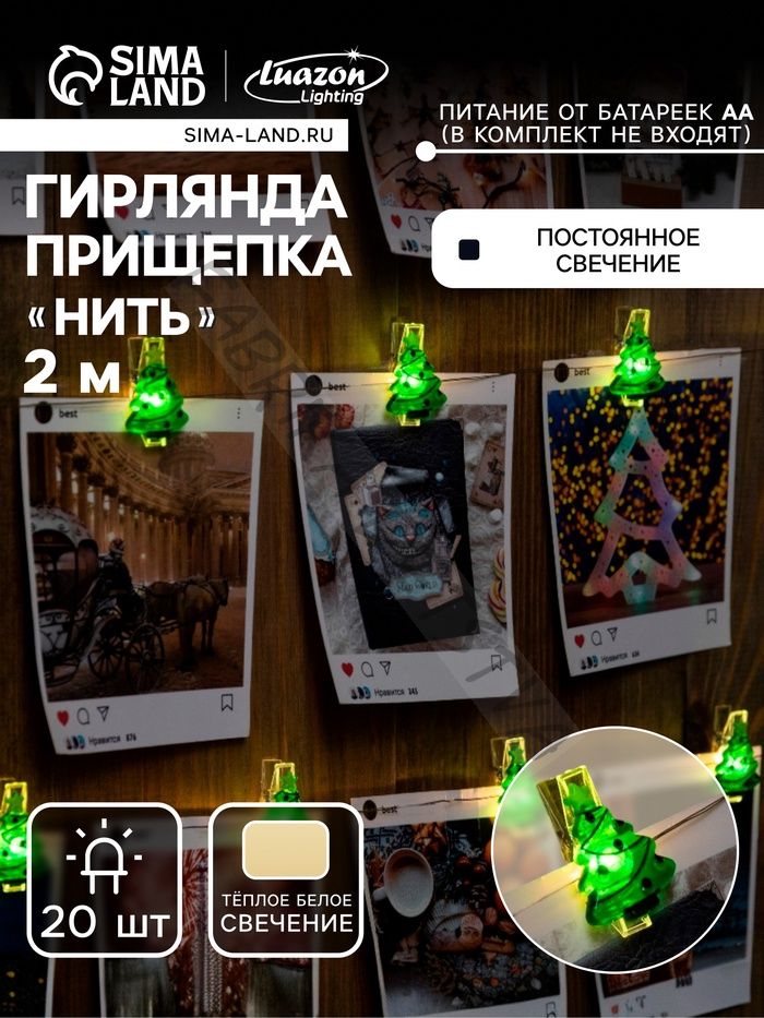 Гирлянда «Нить» 2 м роса с насадками «Прищепки-ёлки», IP20, серебристая нить, 20 LED, батарейки ААх2 (нет в комплекте), свечение тёплое белое