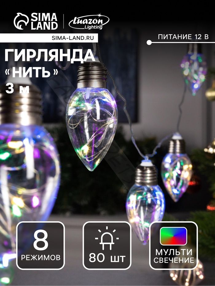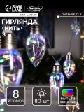 Гирлянда «Нить» 3 м с насадками «Лампочки капля», IP20, прозрачная нить, 80 LED, свечение мульти, 8 режимов, 220 В