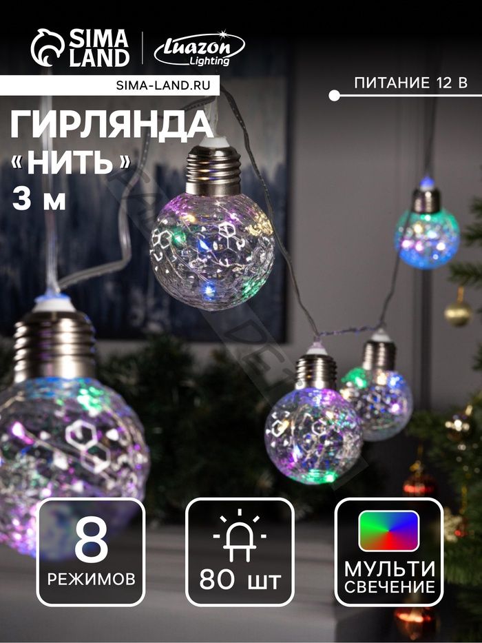 Гирлянда «Нить» 3 м с насадками «Лампочки шары», IP20, прозрачная нить, 80 LED, свечение мульти, 8 режимов, 220 В
