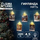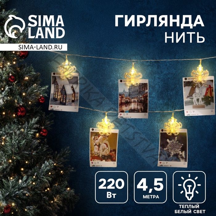Гирлянда «Нить» 4.5 м с насадками «Прищепки-снежинки», IP20, прозрачная нить, 20 LED, свечение тёплое белое, 220 В