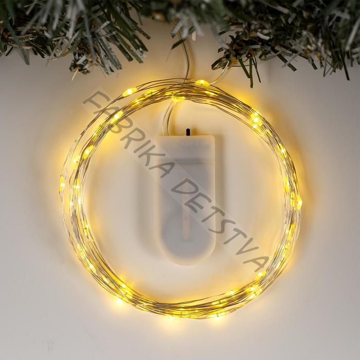 Гирлянда «Нить» 5 м роса, IP20, серебристая нить, 50 LED, батарейки CR2032х2 (в комплекте), свечение жёлтое