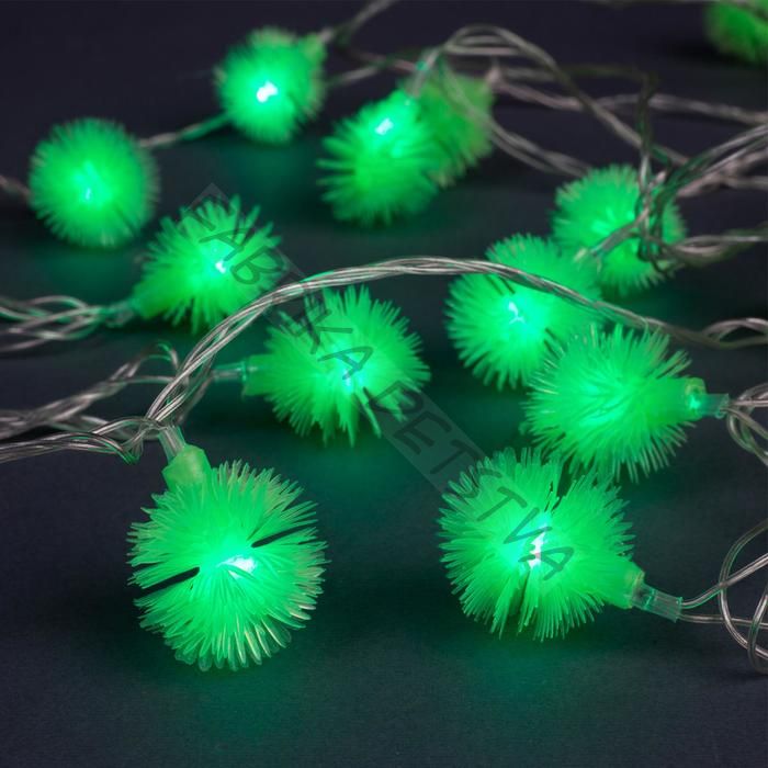 Гирлянда «Нить» 5 м с насадками «Ёжики зелёные», IP20, прозрачная нить, 30 LED, свечение зелёное, 8 режимов, 220 В