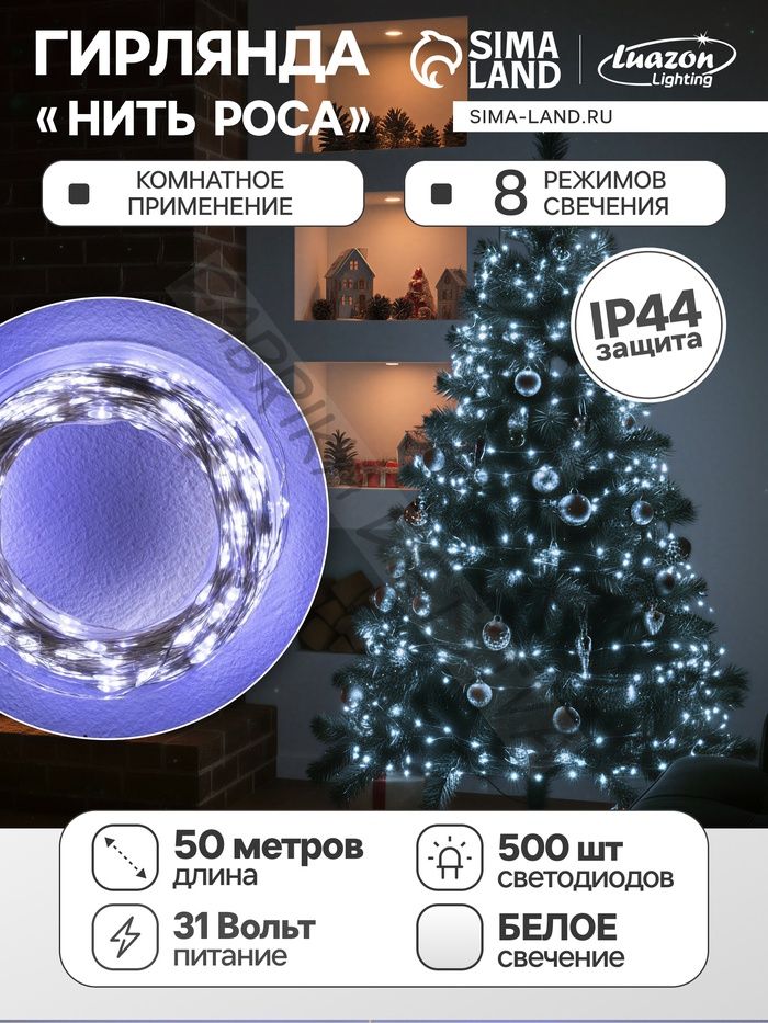 Гирлянда «Нить» 50 м роса, IP44, серебристая нить, 500 LED, свечение белое, 8 режимов, 31 В