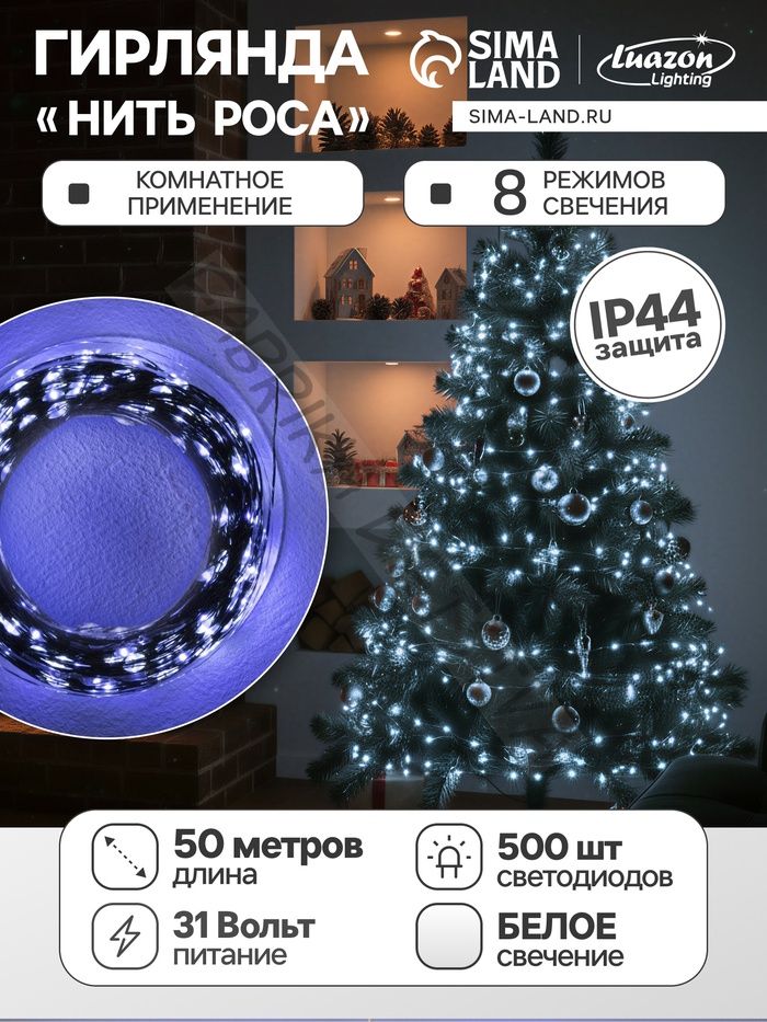 Гирлянда «Нить» 50 м роса, IP44, зелёная нить, 500 LED, свечение белое, 8 режимов, 31 В