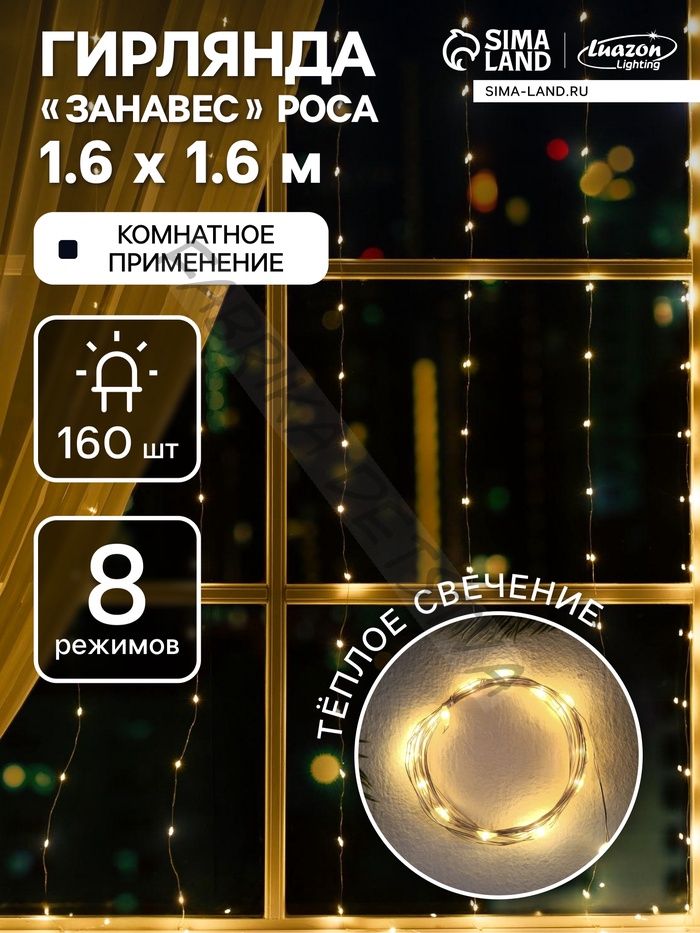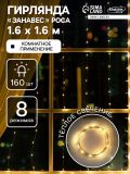 Гирлянда «Занавес» 1.6 x 1.6 м роса, IP20, серебристая нить, 160 LED, свечение тёплое белое, 8 режимов, 220 В