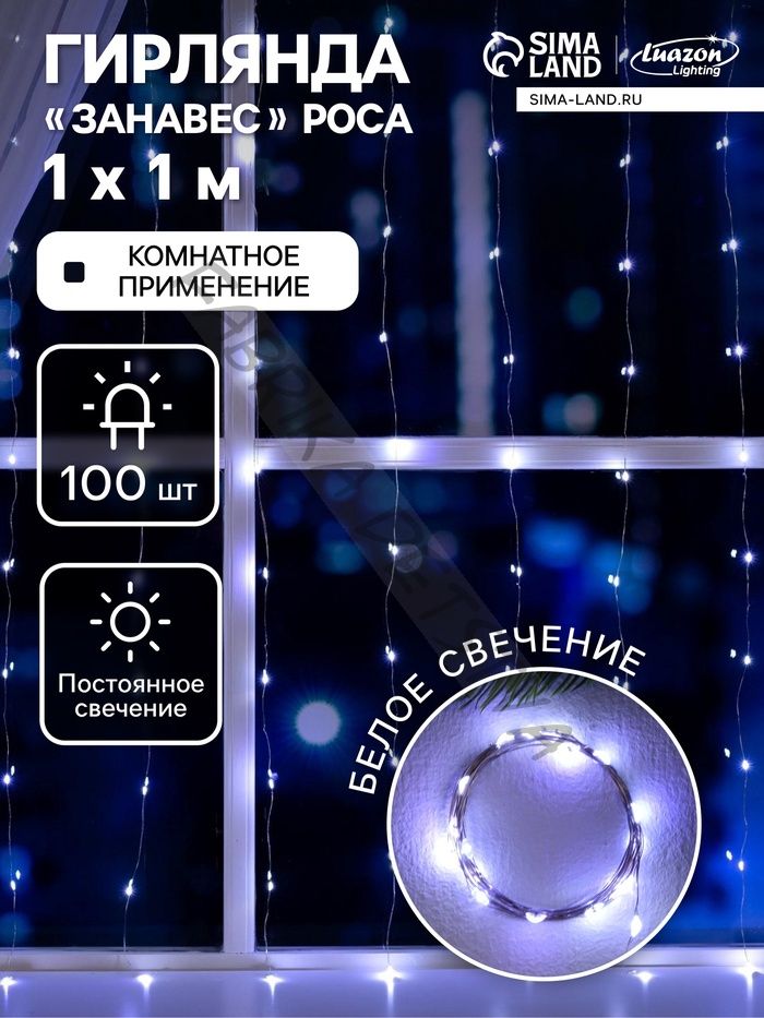 Гирлянда «Занавес» 1 x 1 м роса, IP20, серебристая нить, 100 LED, свечение белое, 12 В