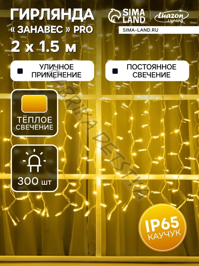 Гирлянда "Занавес" 2 х 1.5 м, IP65, УМС, белая нить каучук, 300 LED, свечение тёплое белое, 220 В