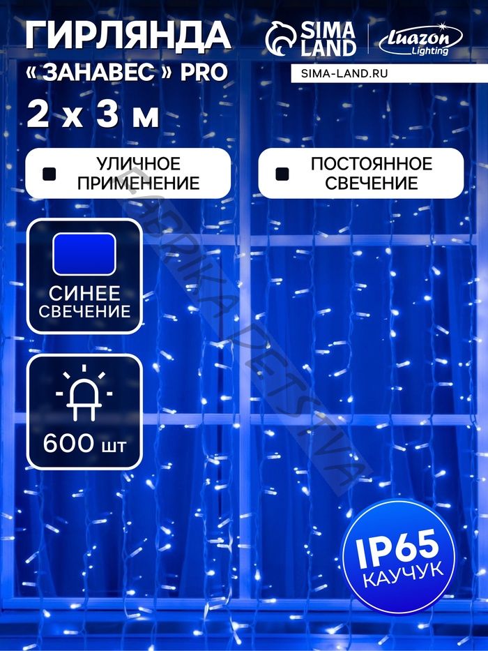 Гирлянда "Занавес" 2 х 3 м, IP65, УМС, белая нить каучук, 600 LED, свечение синее, 220 В