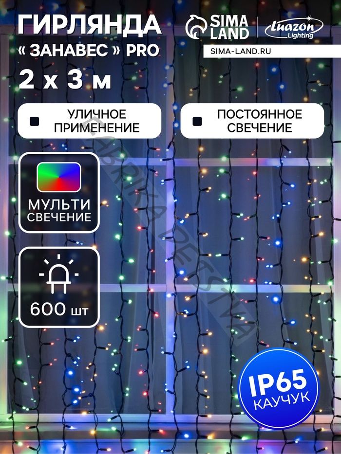 Гирлянда "Занавес" 2 х 3 м, IP65, УМС, тёмная нить каучук, 600 LED, свечение мульти, 220 В