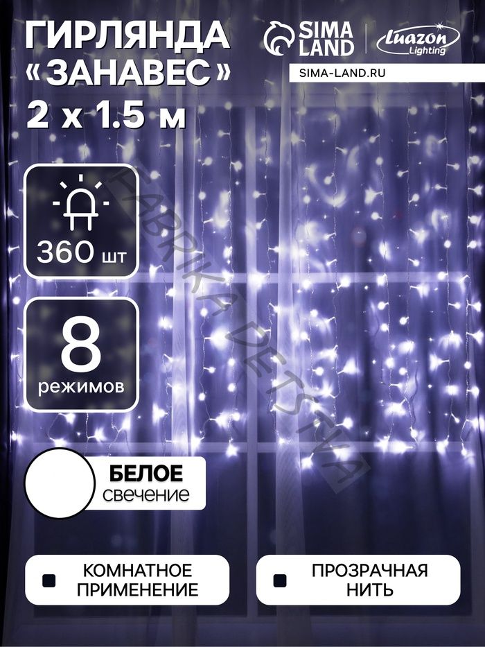 Гирлянда «Занавес» 2 x 1.5 м, IP20, прозрачная нить, 360 LED, свечение белое, 8 режимов, 220 В