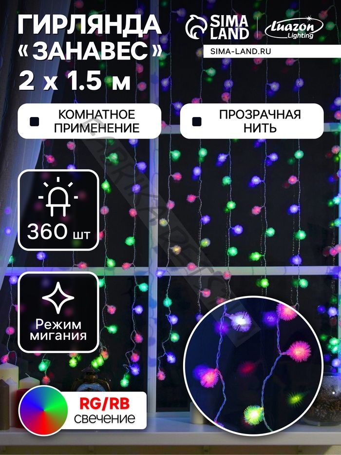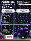 Гирлянда «Занавес» 2 x 1.5 м с насадками «Ёжики», IP20, прозрачная нить, 360 LED, свечение мульти (RG/RB), мигание, 220 В
