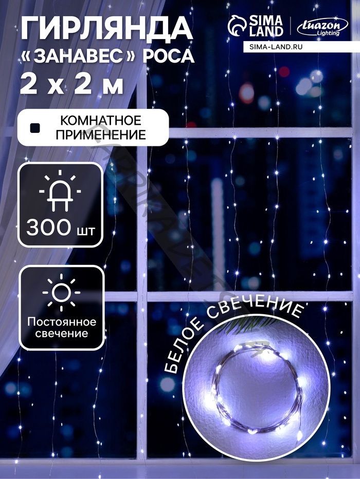 Гирлянда «Занавес» 2 x 2 м роса, IP20, серебристая нить, 300 LED, свечение белое, 12 В
