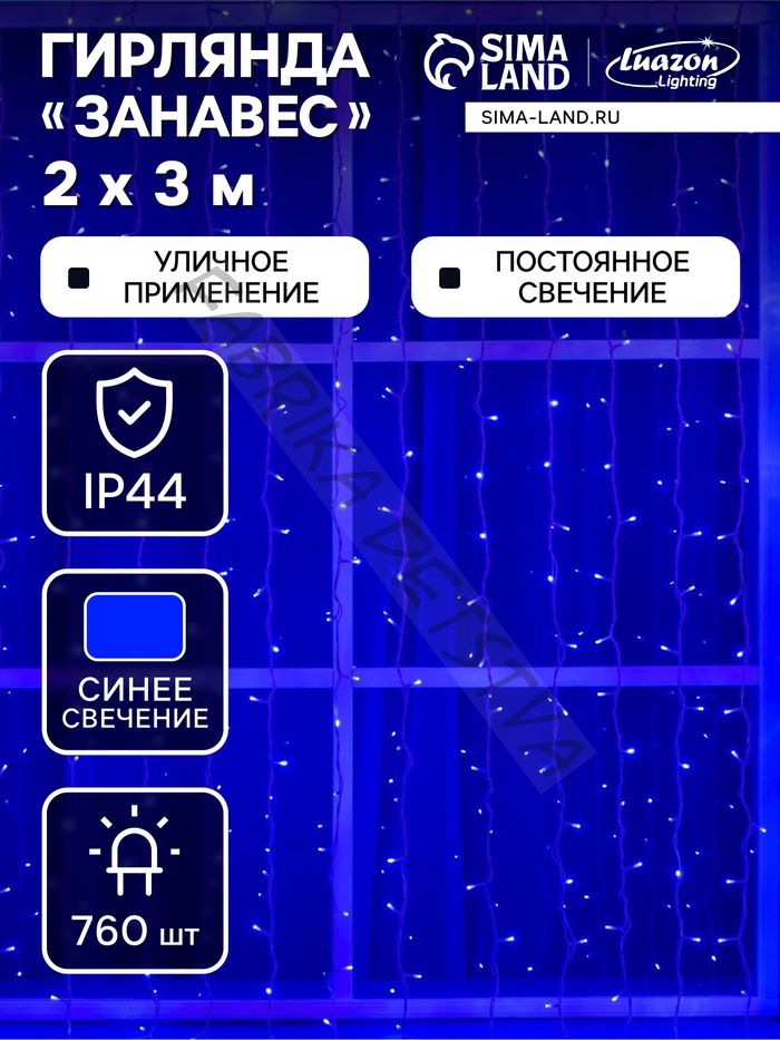 Гирлянда «Занавес» 2 x 3 м, IP44, УМС, белая нить, 760 LED, свечение синее, 220 В