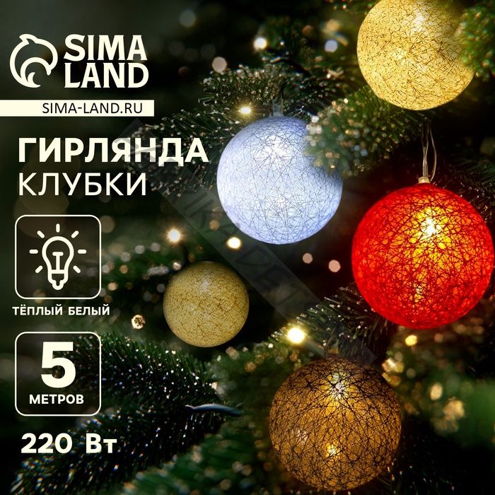 Гирлянда - нить, 5 м с насадками «Клубки красно-голубые», IP20, прозрачная нить, 20 LED, свечение тёплое белое, 220 В