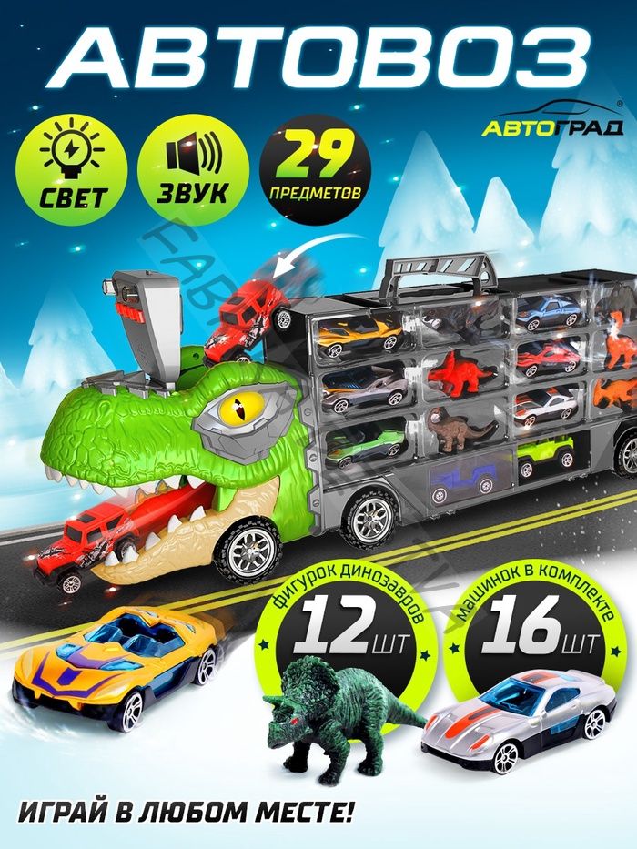 Грузовик большой «Автовоз. Диногонки 2», детский набор: машинки 16 шт., динозавры 12 шт., свет и звук