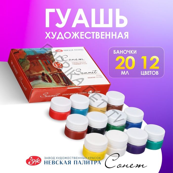 Гуашь художественная, набор 12 цветов x 20 мл, ЗХК «Сонет», (36411571)