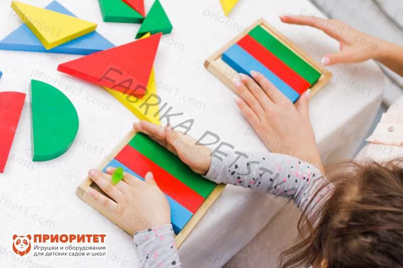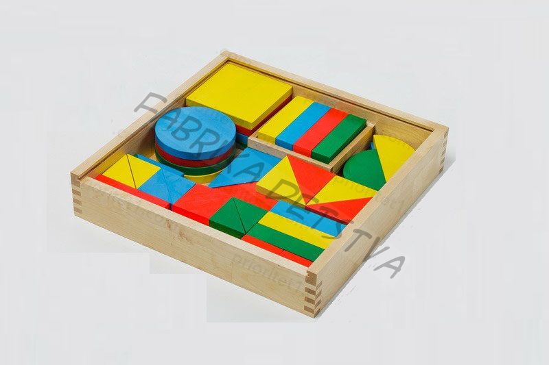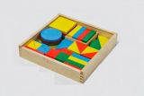 Яркий цветной комплект геометрических фигур используется для развивающих занятий детей дошкольного возраста. В наборе: деревянный ящичек и множество различных треугольников, квадратов, кругов, прямоугольников.