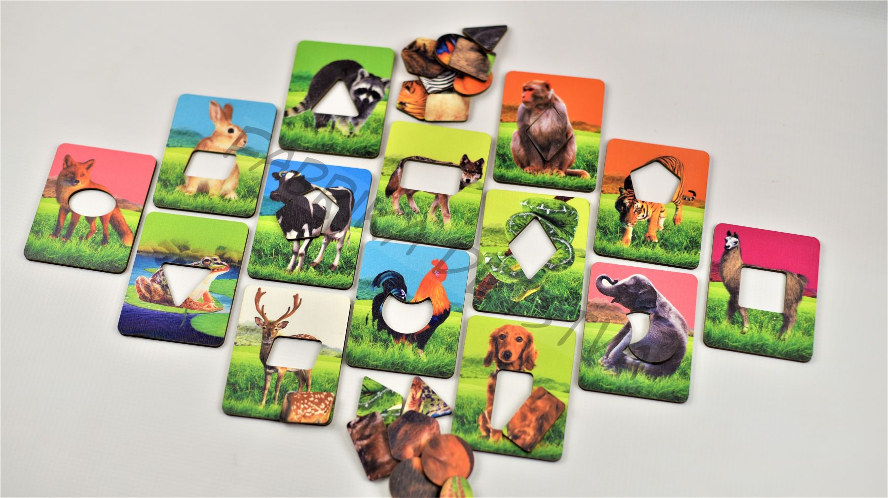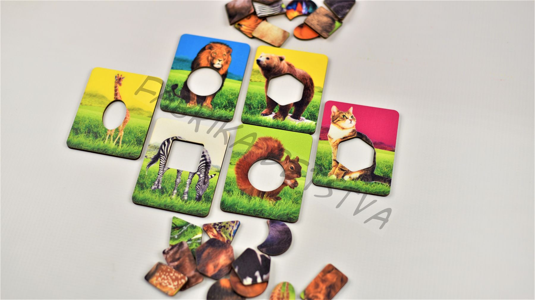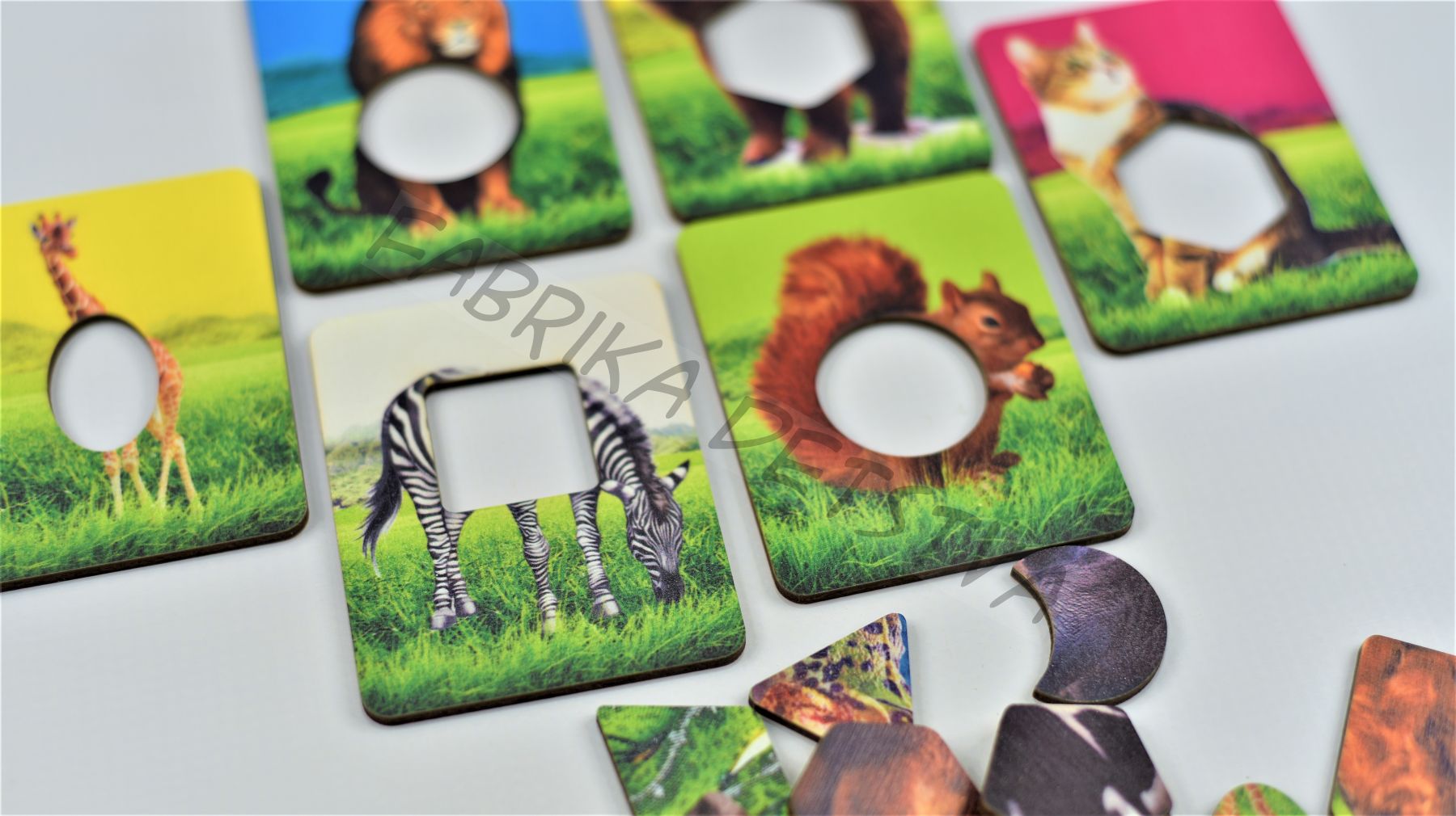 Развивающая игрушки представляет собой красочно оформленные деревянные пластины в виде картинок ЖИВОТНЫХ (20 штук) с пазами посередине, имеющими различную геометрическую форму. Необходим вложить ту геометрическую фигуру с ИЗОБРАЖЕНИЕМ ЧАСТИ ШКУРКИ ПЕРСОНАЖА в паз пластины, которая походит по форме, размеру и соответствует общему рисунку.