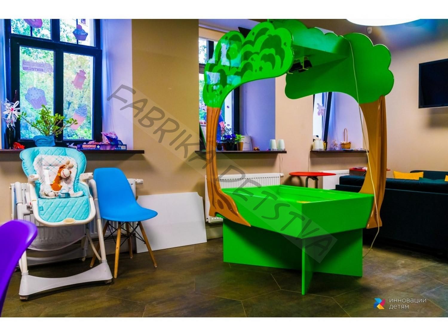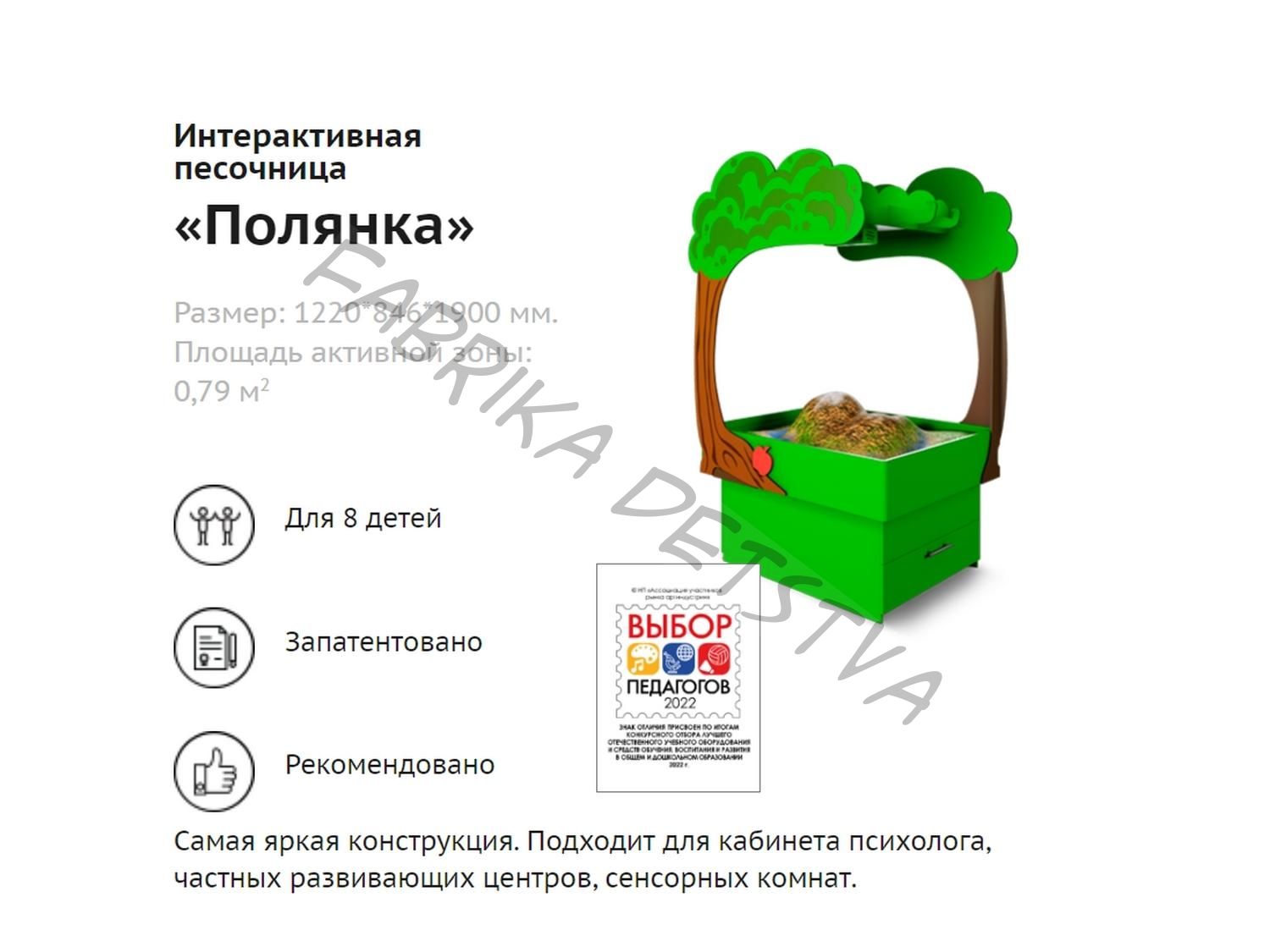 Интерактивная песочница «Полянка» прекрасно впишется в интерьер кабинета психолога, частных развивающих центров или сенсорных комнат. Её габариты позволяют проводить занятия для группы из 8 детей одновременно.