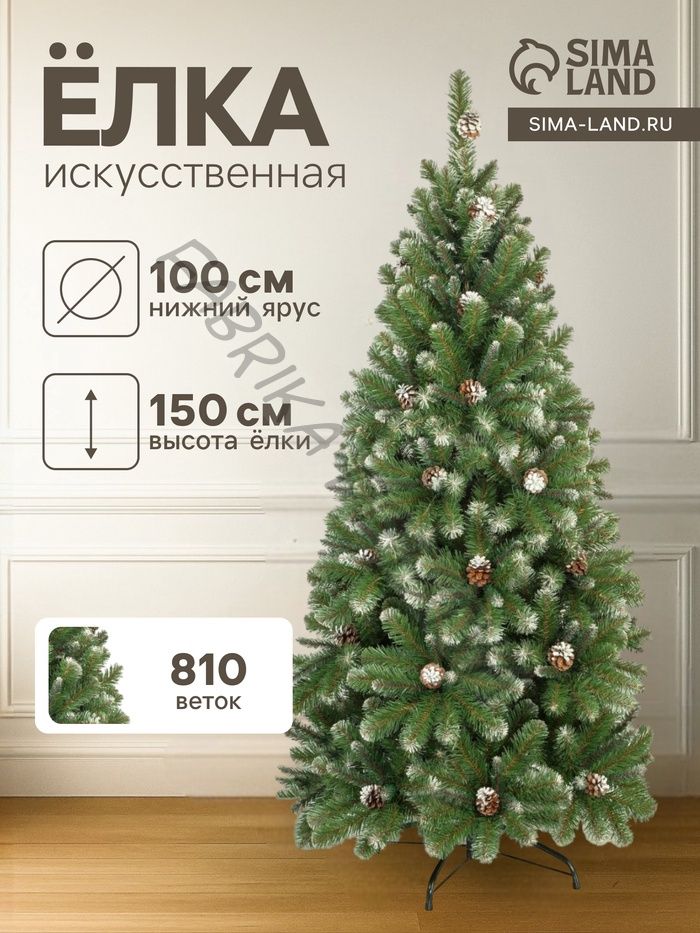 Искусственная ёлка заснеженная «ЕлкиТорг. Снежная королева» с шишками, 150 см, d нижнего яруса 100 см, 810 ПВХ веток на крючках