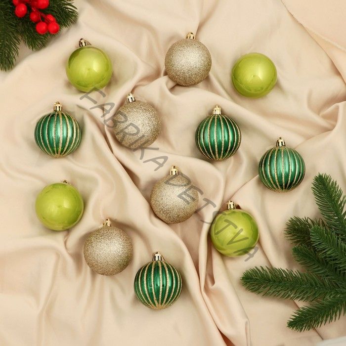 Ёлочные игрушки «Агнет», шары новогодние, d=6 см, набор 12 шт., полосы, блеск, зелёный/золотистый